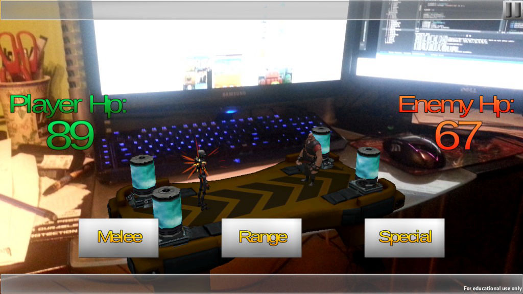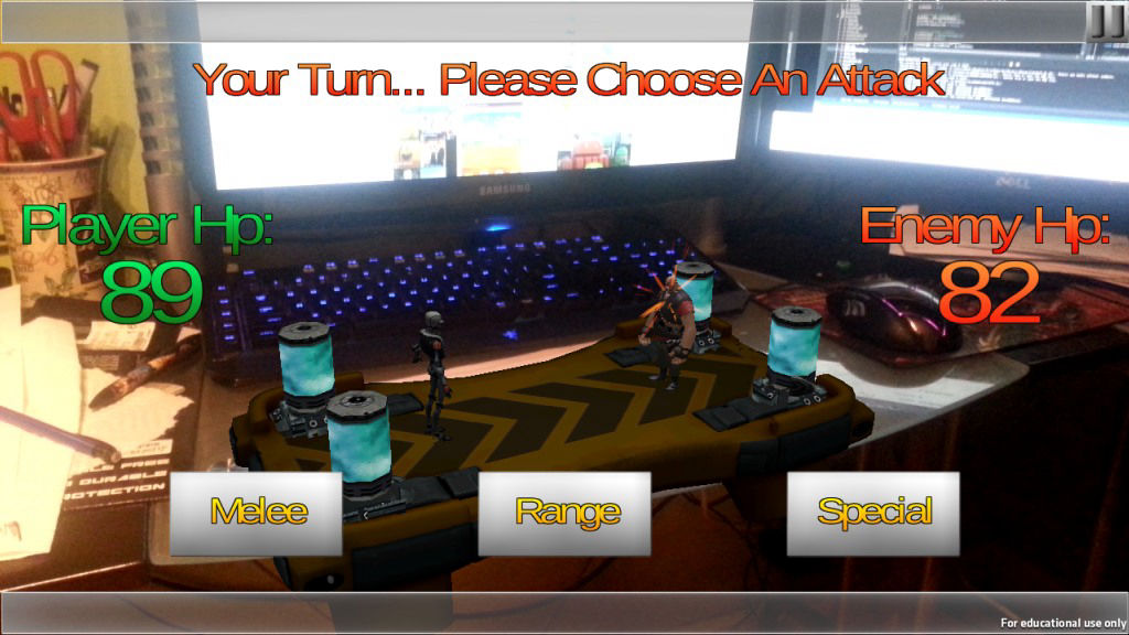 I wanted to do a deep dive into then current augemented reality technologies. The naturally led me into using Vuforia and its integration wit Unity. I set up 3 types of cards: battleground, player character and enemy character. The user would initially choose one of 2 battlegrounds, then choose one of 3 characters for themselves and another for the AI. Each of these was a different image target that the game recognized and loaded up the appropriate assets.