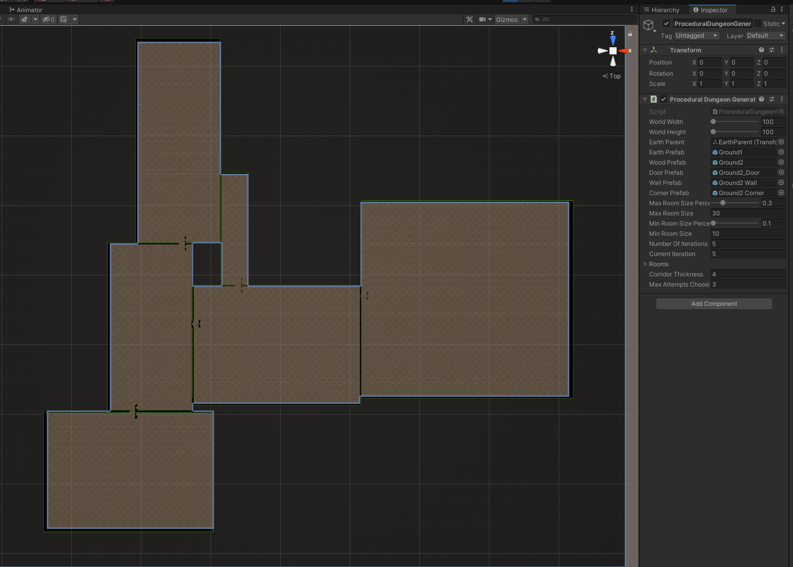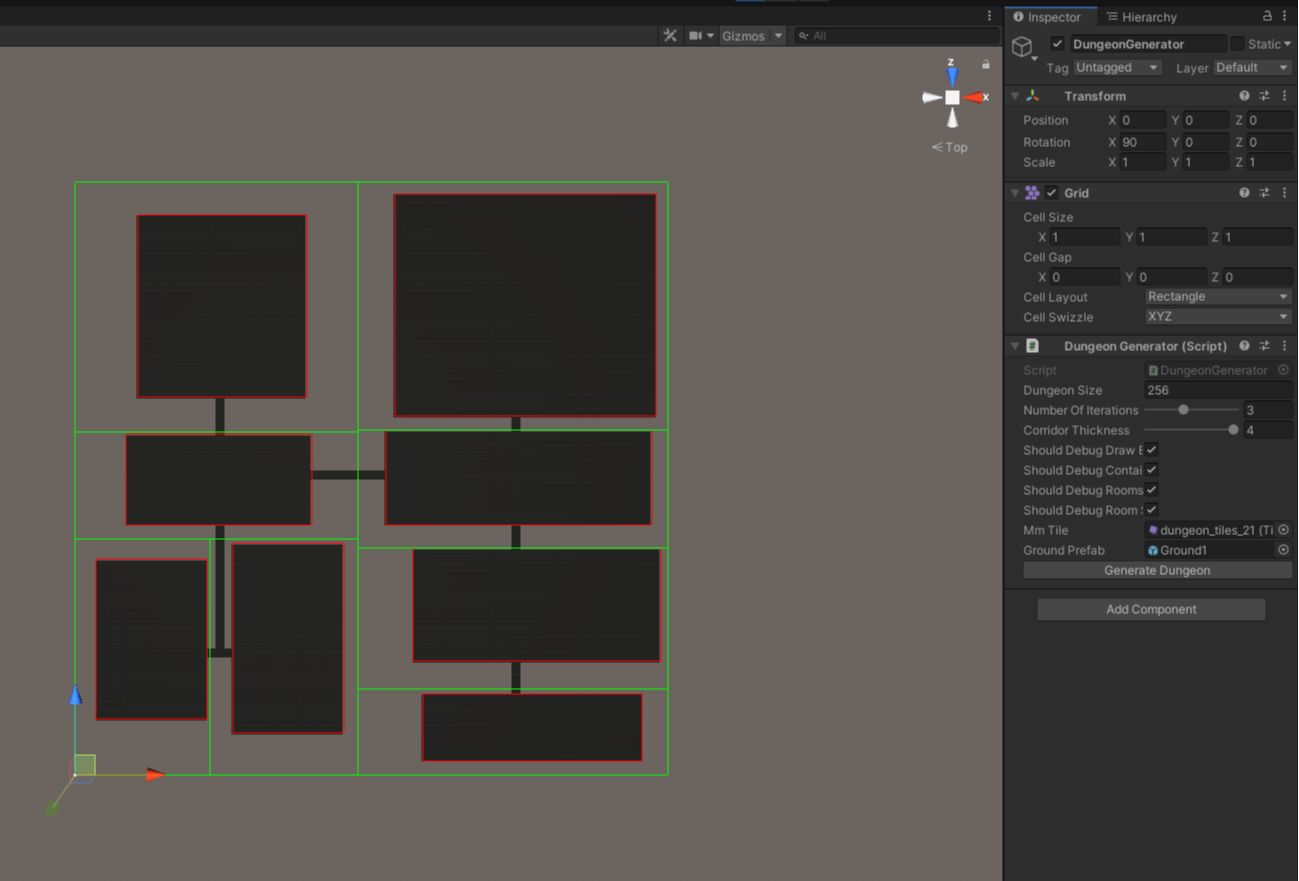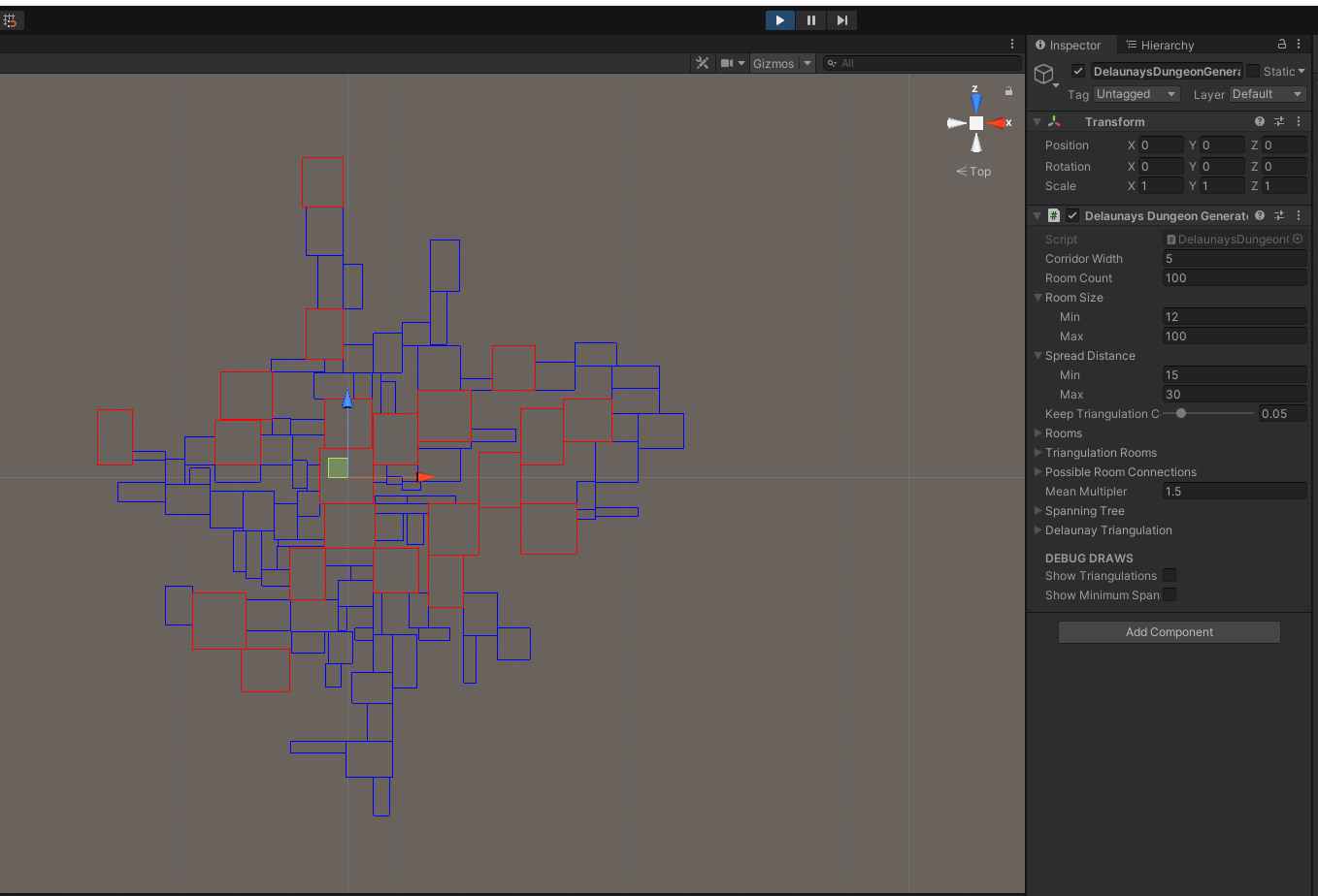 The technique starts by creating a number of varying rectangles at the center of the space. They are then pushed outwards in a circle till none of them overlap. Then based on some type of parameter, 150% of the mean size of all rooms, main rooms are chosen. These rooms are then triangulated to make the connections between them. Of those connections only a few of them are chosen by using a minimum spanning tree.